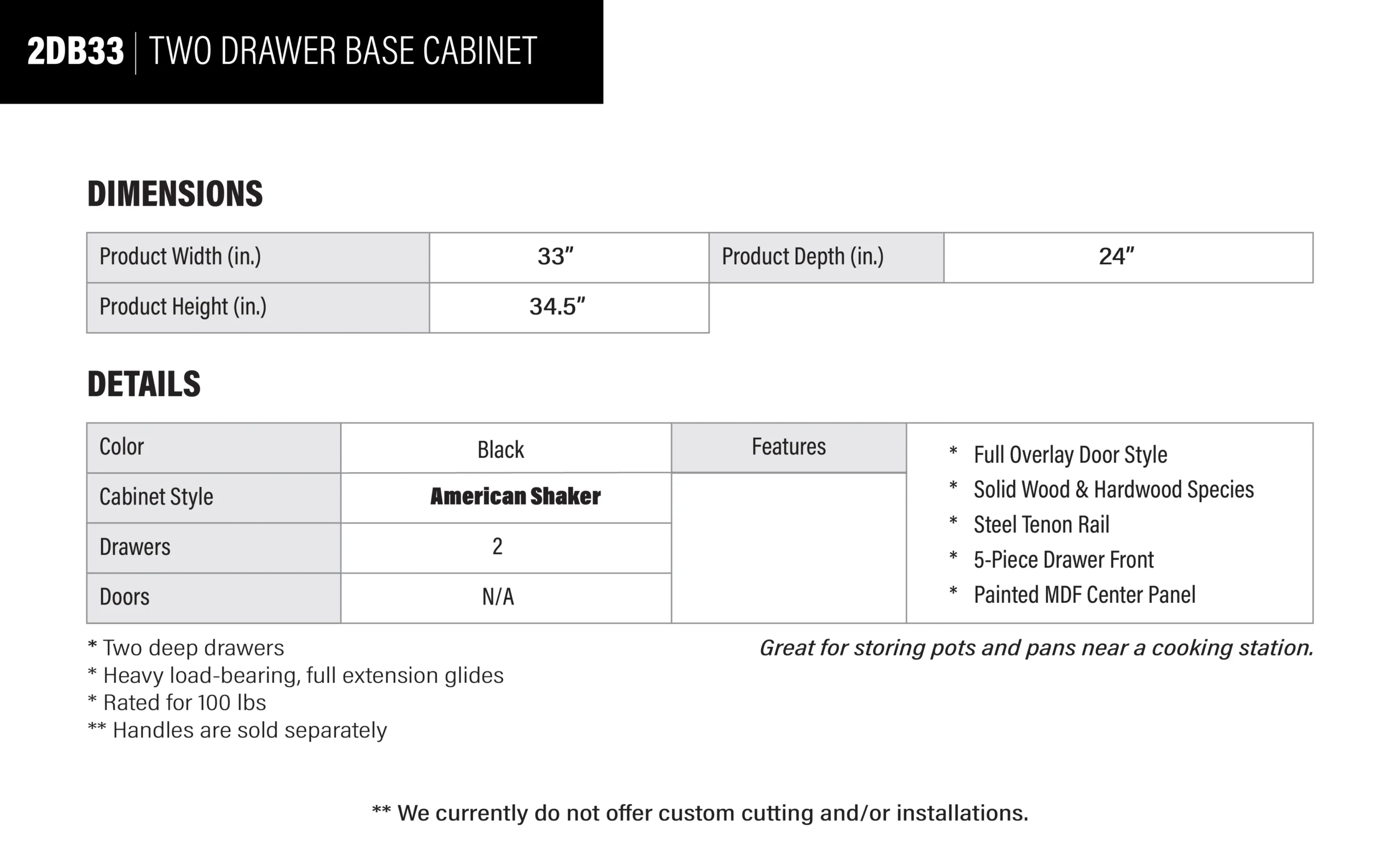 Be the first to review “Black Shaker 2 Drawer Kitchen Base Cabinet – 33″ W x 34.5″ H x 24″ D” Cancel reply