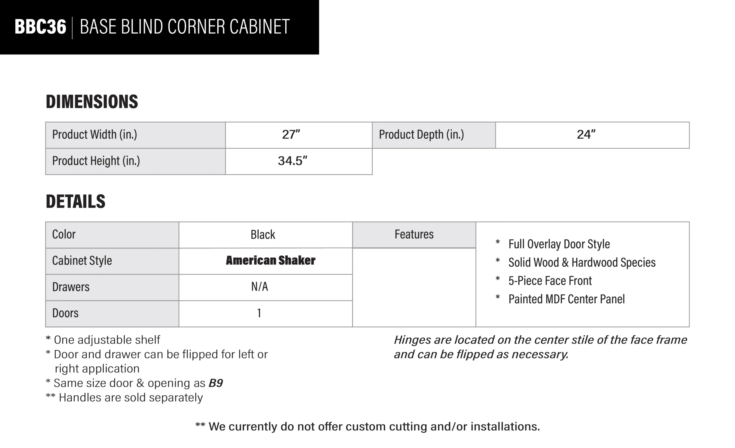 Be the first to review “Black Shaker Base Blind Corner Cabinet – 27″ W x 34.5″ H x 24″ D” Cancel reply