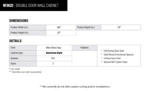 Be the first to review “Dark Taupe Shaker Double Door Wall Cabinet – 36″ W x 21″ H x 12″ D” Cancel reply