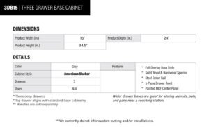 Be the first to review “Earth Grey Shaker 3 Drawer Kitchen Base Cabinet – 15″ W x 34.5″ H x 24″ D” Cancel reply