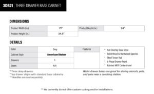 Be the first to review “Earth Grey Shaker 3 Drawer Kitchen Base Cabinet – 21″ W x 34.5″ H x 24″ D” Cancel reply