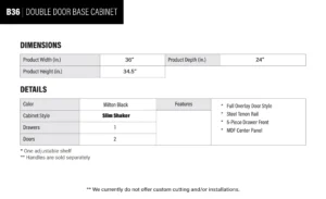 Be the first to review “Elite Black Slim Shaker 1 Drawer 2 Door Kitchen Base Cabinet – 36″ W x 34.5″ H x 24″ D” Cancel reply