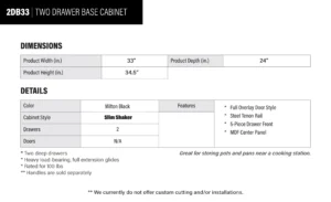 Be the first to review “Elite Black Slim Shaker 2 Drawer Kitchen Base Cabinet – 33″ W x 34.5″ H x 24″ D” Cancel reply