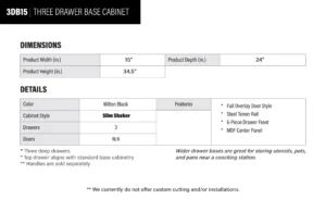 Be the first to review “Elite Black Slim Shaker 3 Drawer Kitchen Base Cabinet – 15″ W x 34.5″ H x 24″ D” Cancel reply