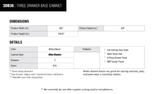 Be the first to review “Elite Black Slim Shaker 3 Drawer Kitchen Base Cabinet – 36″ W x 34.5″ H x 24″ D” Cancel reply