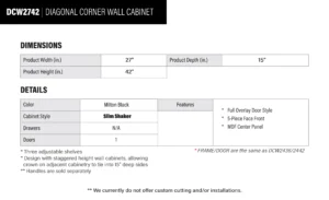 Be the first to review “Elite Black Slim Shaker Diagonal Wall Corner Cabinet – 27″ W x 42″ H x 15″ D” Cancel reply