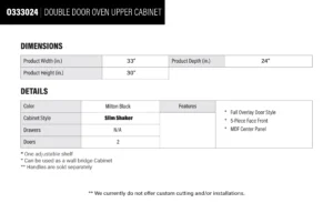 Be the first to review “Elite Black Slim Shaker Double Door Oven Upper Cabinet – 33″ W x 30″ H x 24″ D” Cancel reply