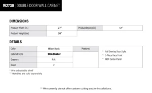 Be the first to review “Elite Black Slim Shaker Double Door Wall Cabinet – 27″ W x 30″ H x 12″ D” Cancel reply