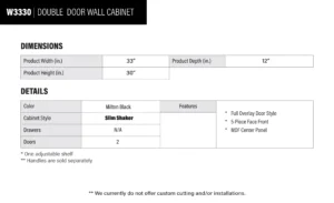 Be the first to review “Elite Black Slim Shaker Double Door Wall Cabinet – 33″ W x 30″ H x 12″ D” Cancel reply