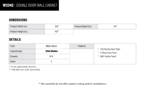 Be the first to review “Elite Black Slim Shaker Double Door Wall Cabinet – 33″ W x 42″ H x 12″ D”