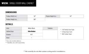 Be the first to review “Elite Black Slim Shaker Single Door Wall Cabinet – 12″ W x 36″ H x 12″ D” Cancel reply