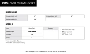Be the first to review “Elite Black Slim Shaker Single Door Wall Cabinet – 9″ W x 36″ H x 12″ D” Cancel reply