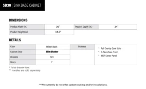 Be the first to review “Elite Black Slim Shaker Sink Base Kitchen Cabinet – 30″ W x 34.5″ H x 24″ D” Cancel reply