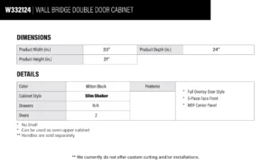 Be the first to review “Elite Black Slim Shaker Wall Bridge Double Door Cabinet – 33″ W x 21″ H x 24″ D” Cancel reply