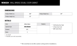 Be the first to review “Elite Black Slim Shaker Wall Bridge Double Door Cabinet – 36″ W x 12″ H x 24″ D” Cancel reply
