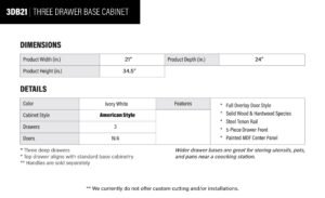 Be the first to review “Milkshake White 3 Drawer Kitchen Base Cabinet – 21″ W x 34.5″ H x 24″ D” Cancel reply