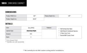 Be the first to review “Milkshake White Sink Base Kitchen Cabinet – 33″ W x 34.5″ H x 24″ D” Cancel reply