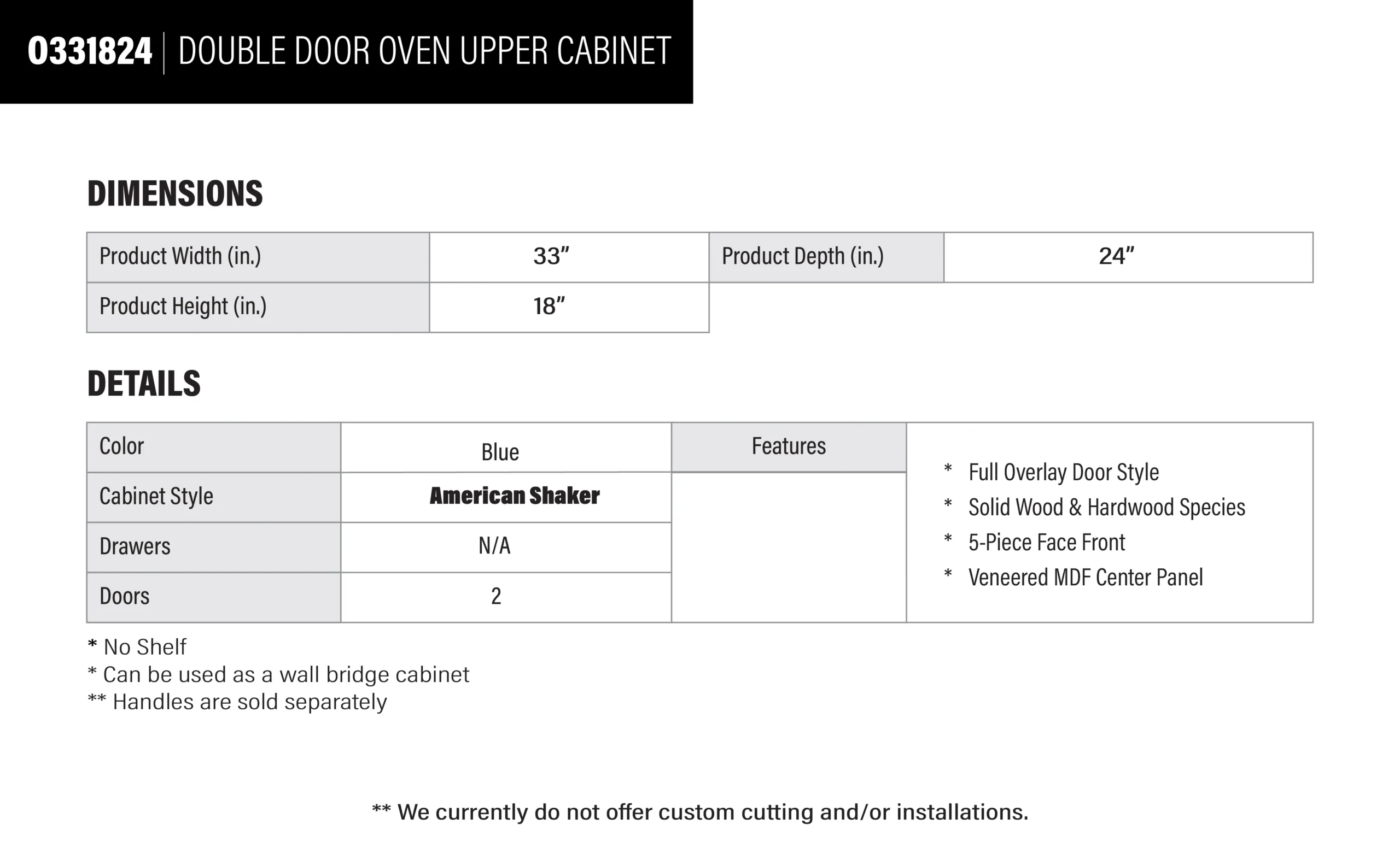 Royal Blue Shaker Double Door Oven Upper Cabinet – 33″ W x 18″ H x 24″ D