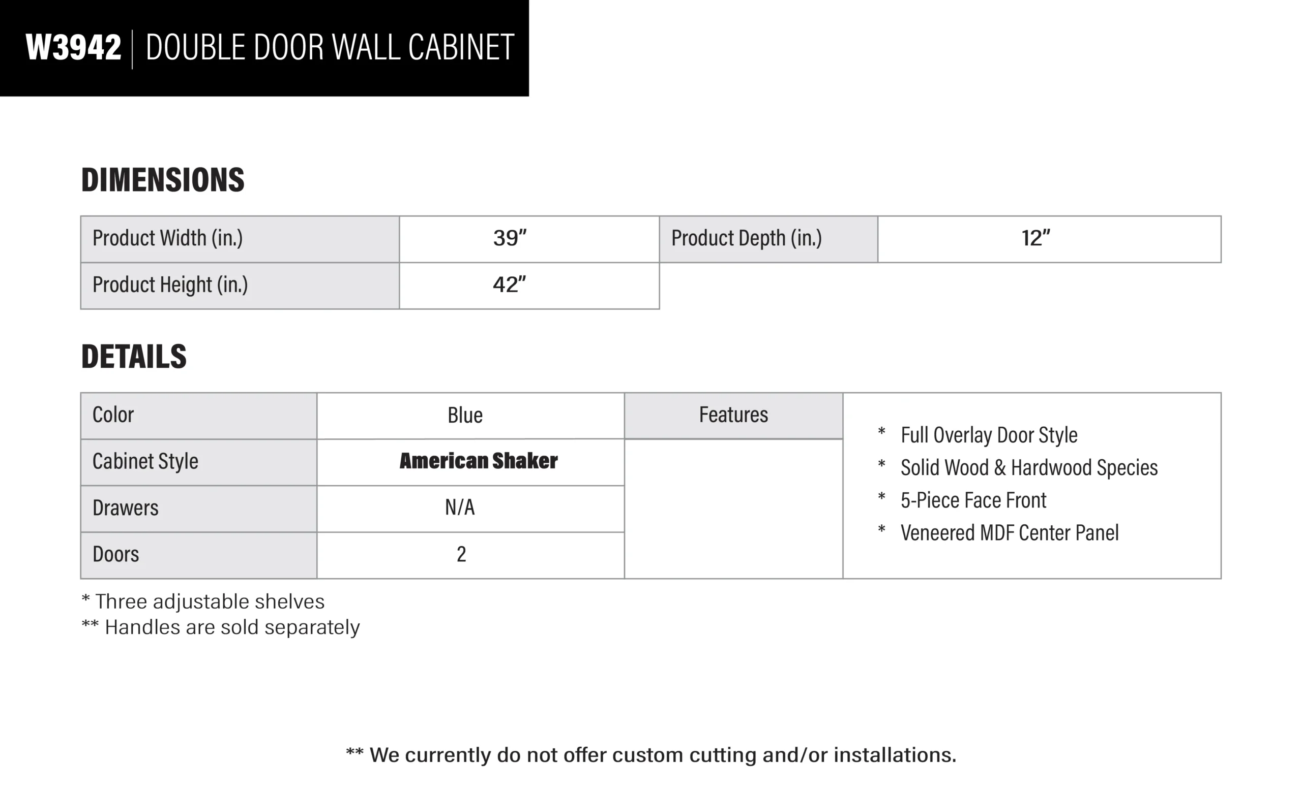 Be the first to review “Royal Blue Shaker Double Door Wall Cabinet – 39″ W x 42″ H x 12″ D”